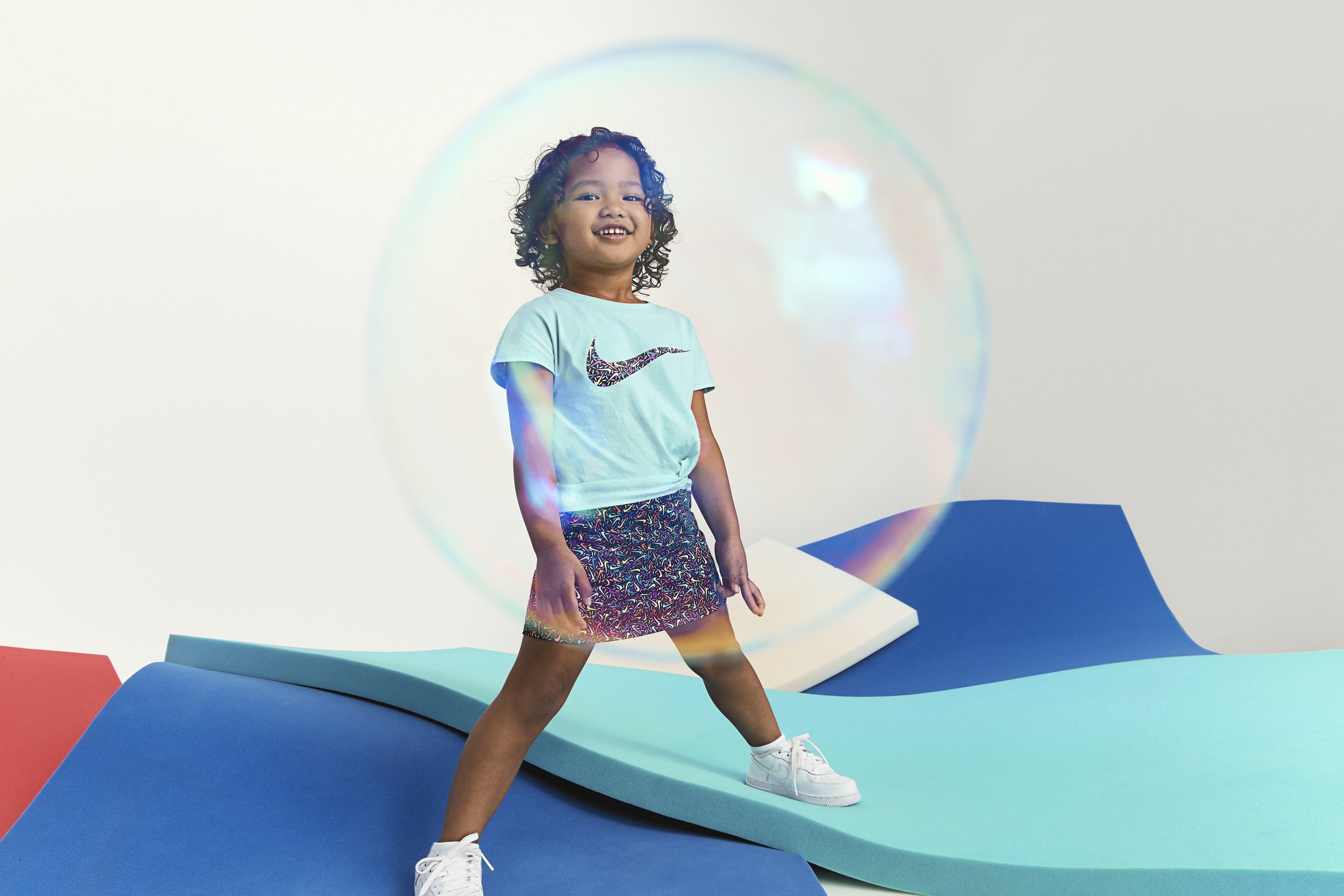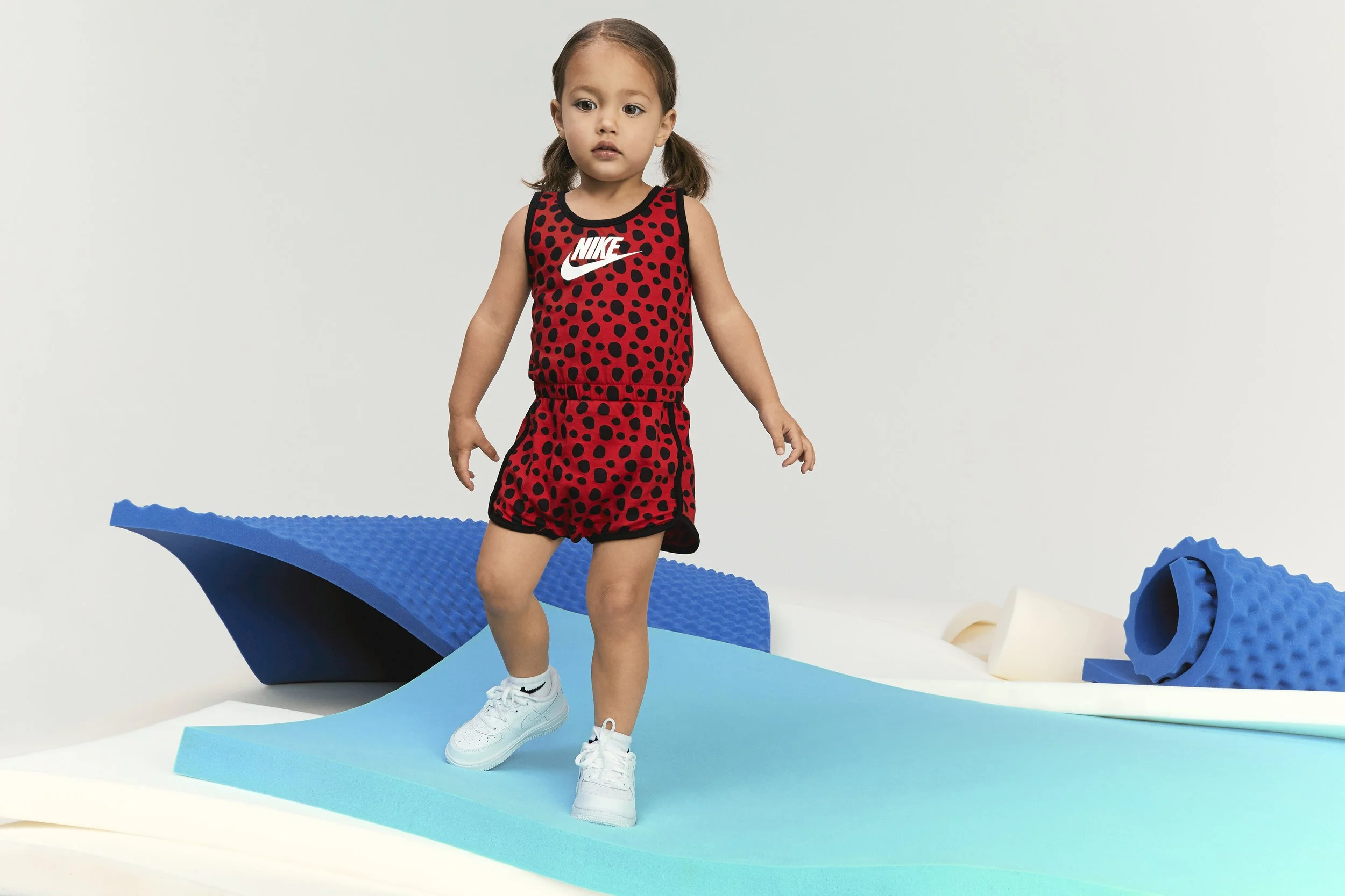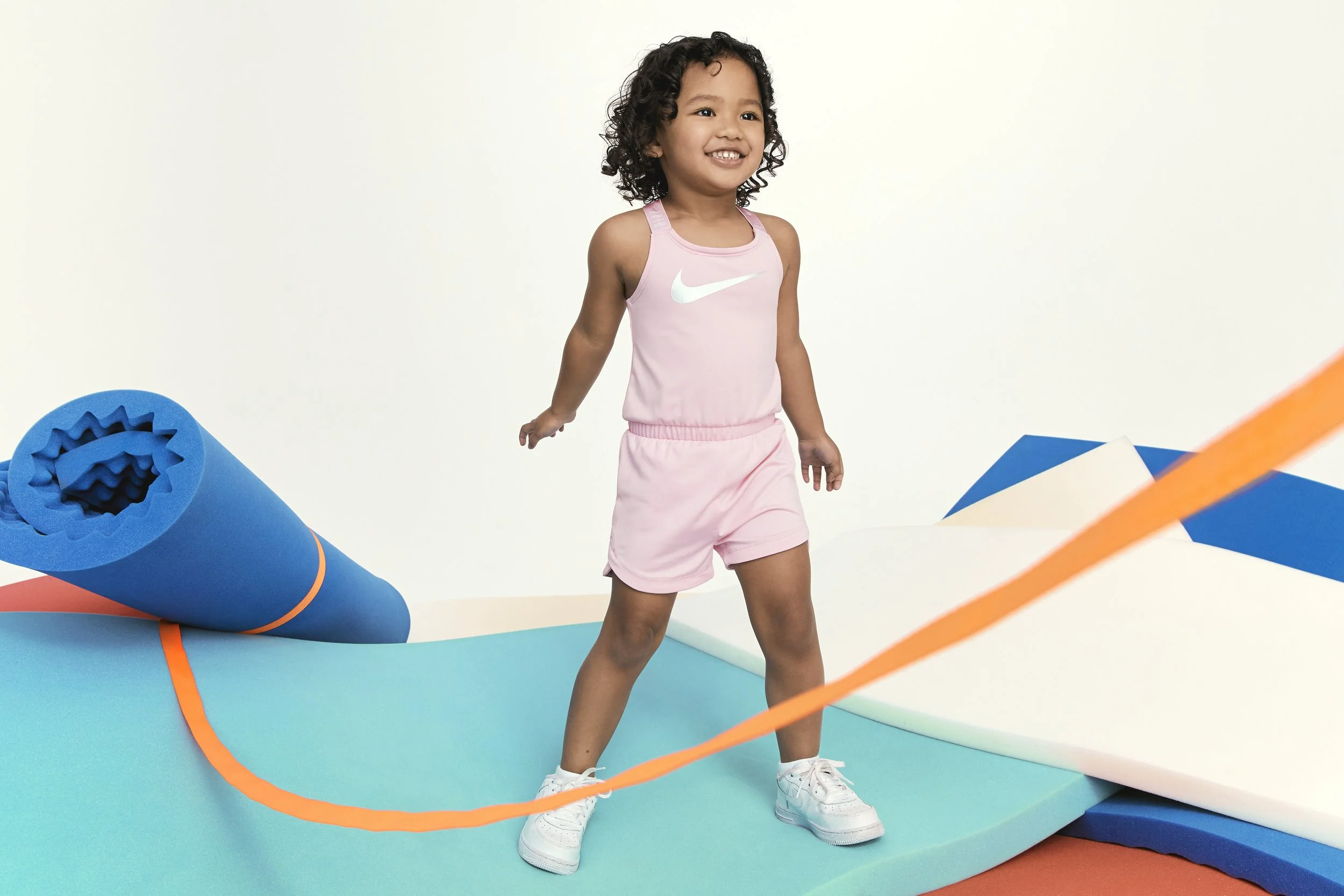 CREATIVE NOTES Production design for a Nike Kids photoshoot. Sourced and shaped oversized foam elements — rolls, waves, textured slabs — in saturated color, layering them to build sculptural scenes that kids could climb, lean into, and play against. Every set piece was physical, tactile, and scaled to turn the studio into something that felt like a playground