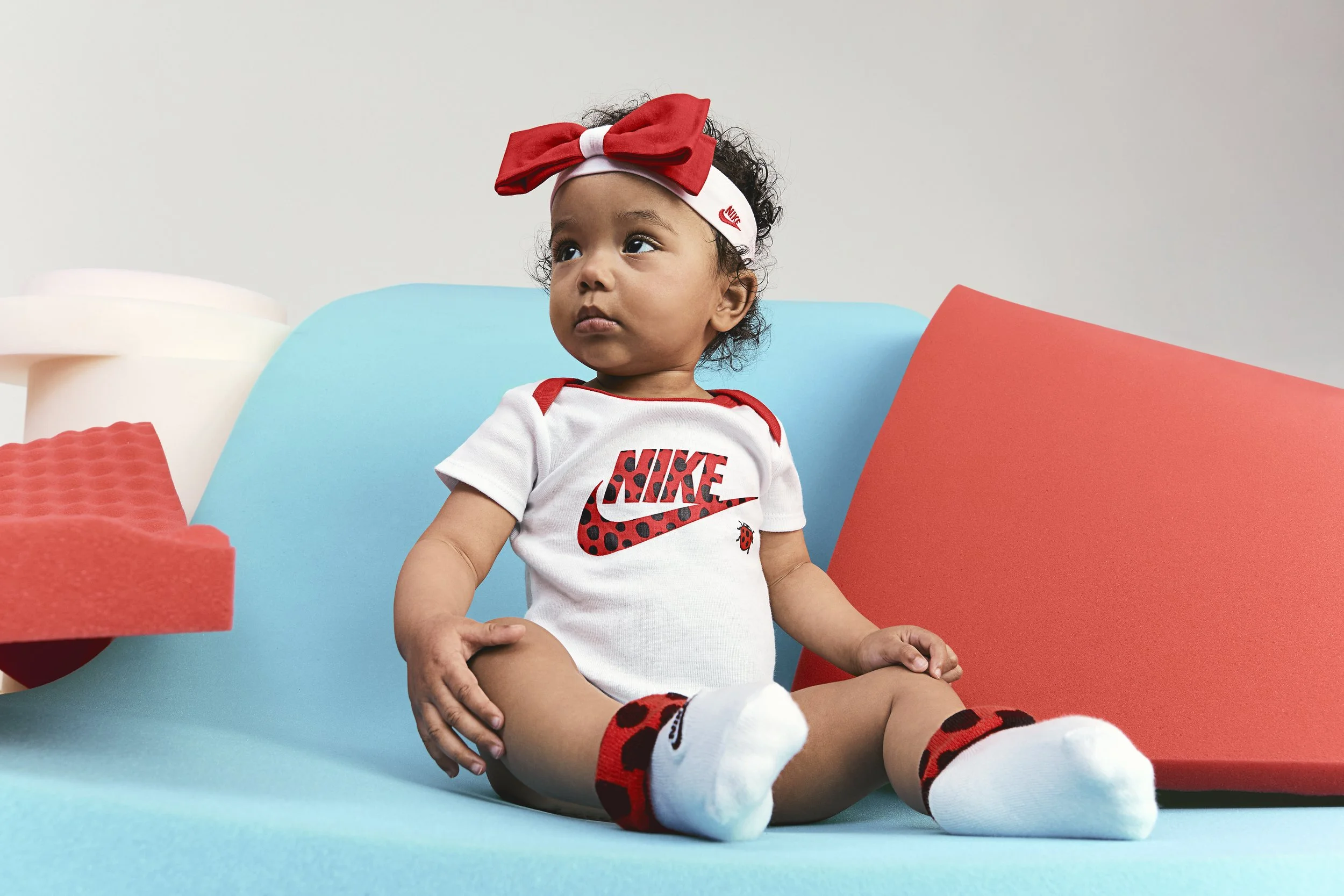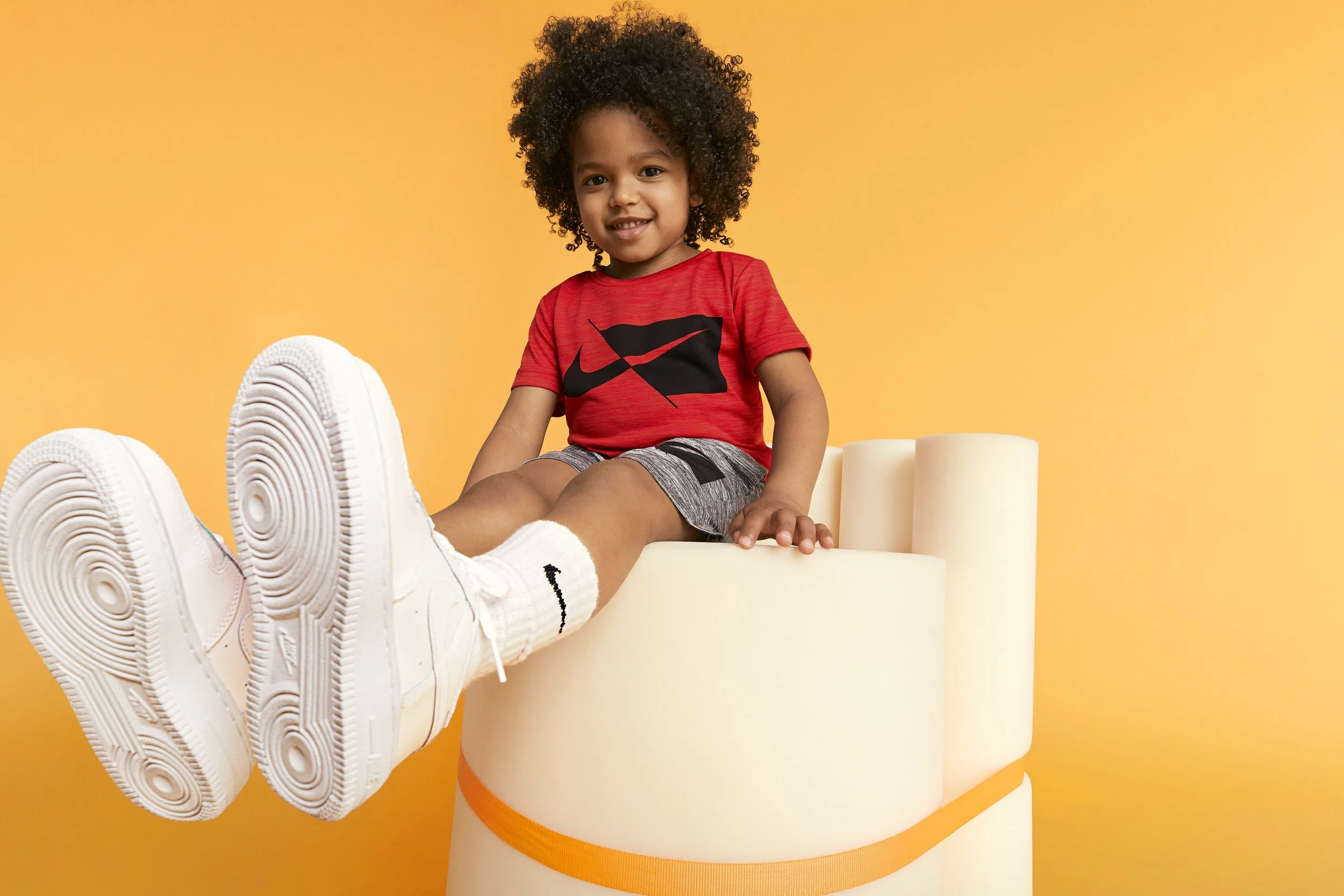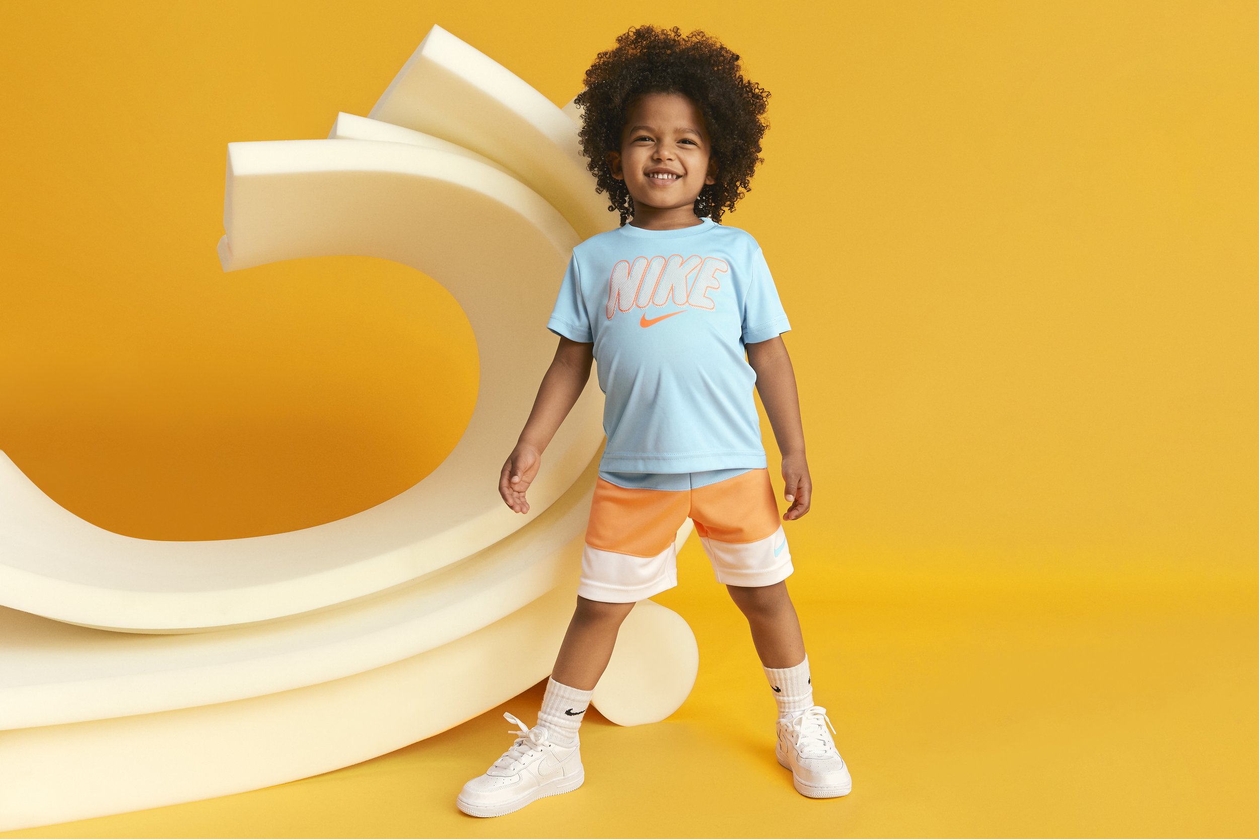 CREATIVE NOTES Production design for a Nike Kids photoshoot. Sourced and shaped oversized foam elements — rolls, waves, textured slabs — in saturated color, layering them to build sculptural scenes that kids could climb, lean into, and play against. Every set piece was physical, tactile, and scaled to turn the studio into something that felt like a playground
